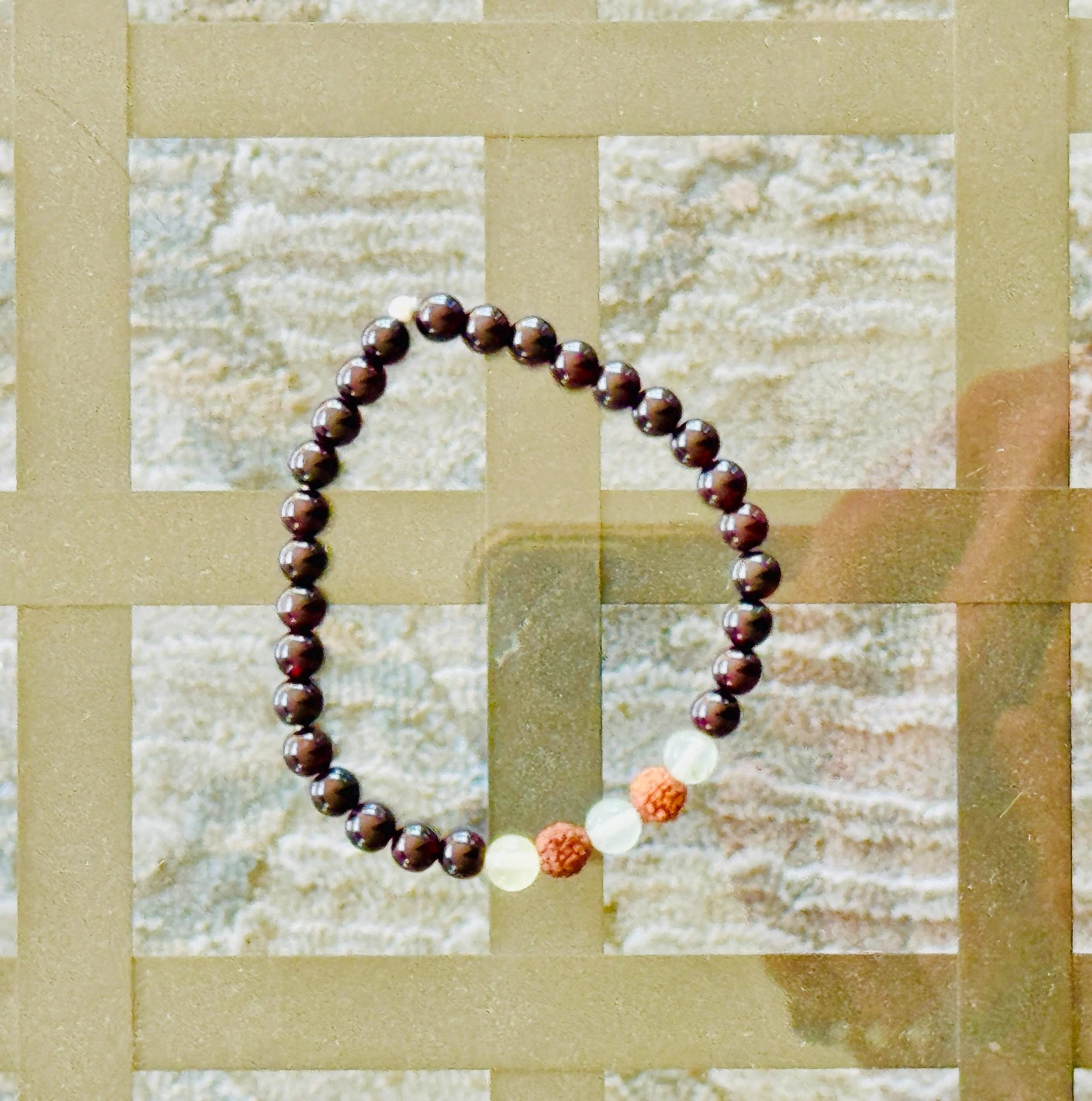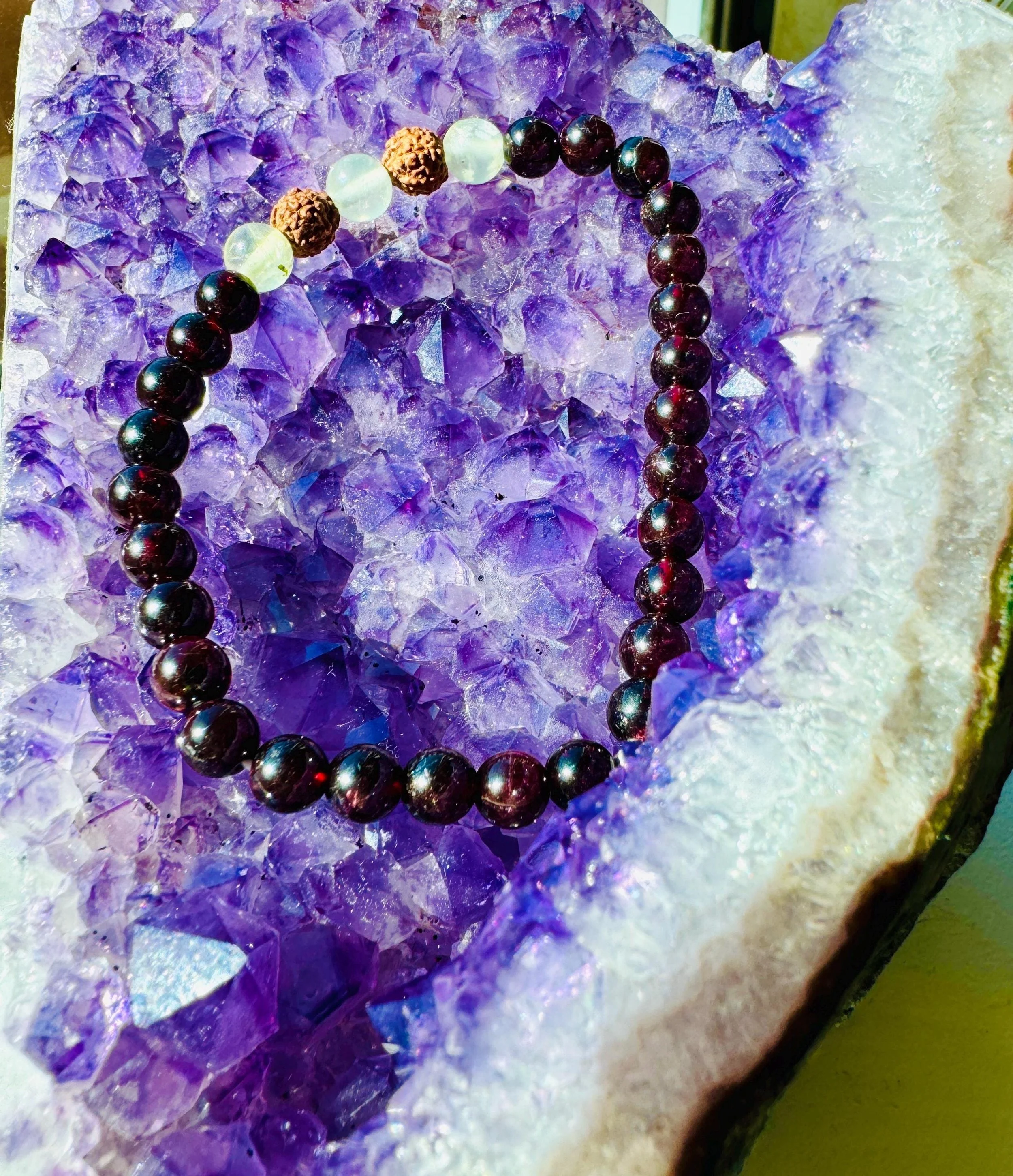 Root + Heart #12 - Garnet Prehnite Rudraksha Bracelet: Sterling Silver Accent, Chakra Protection Jewelry