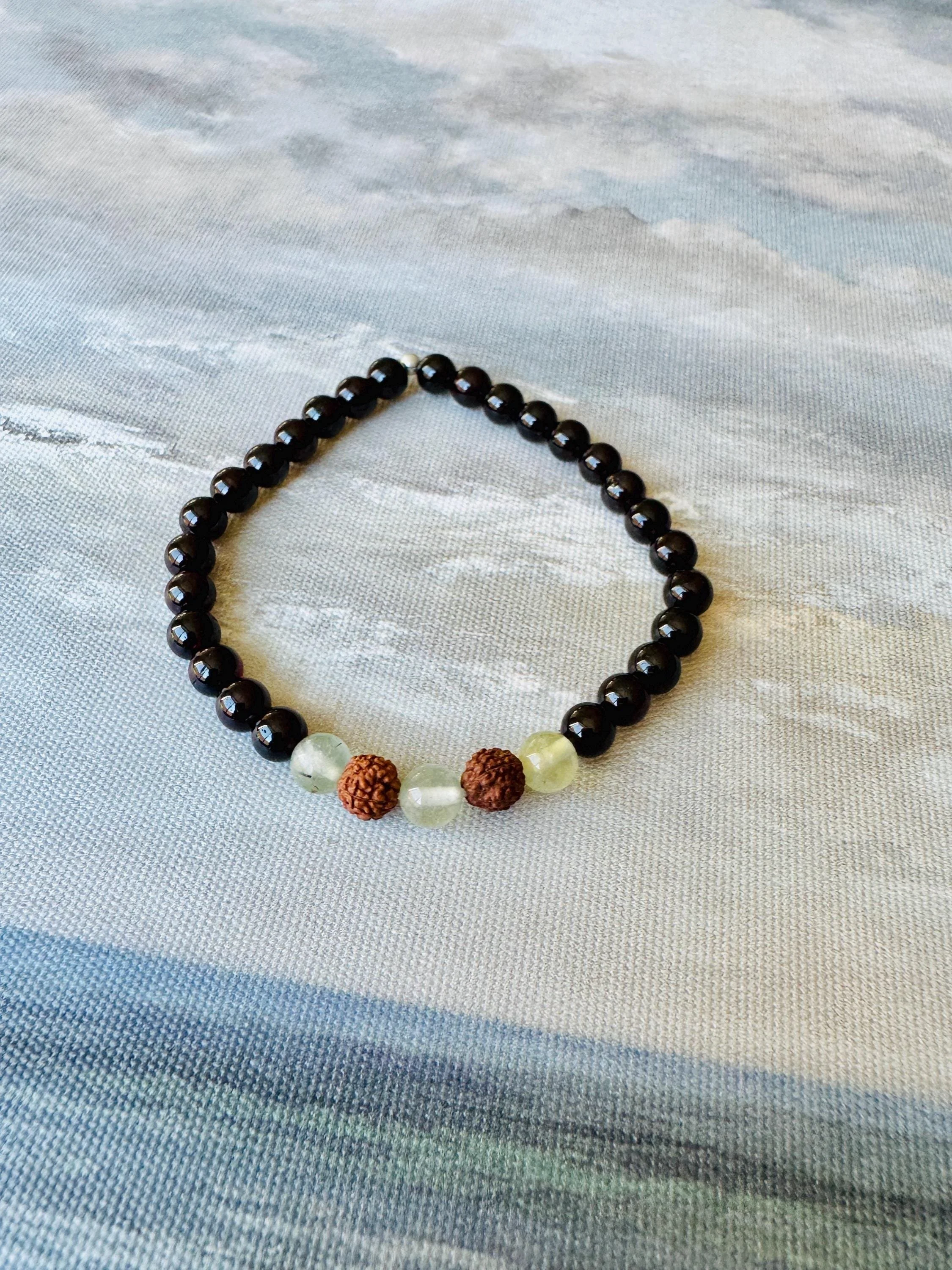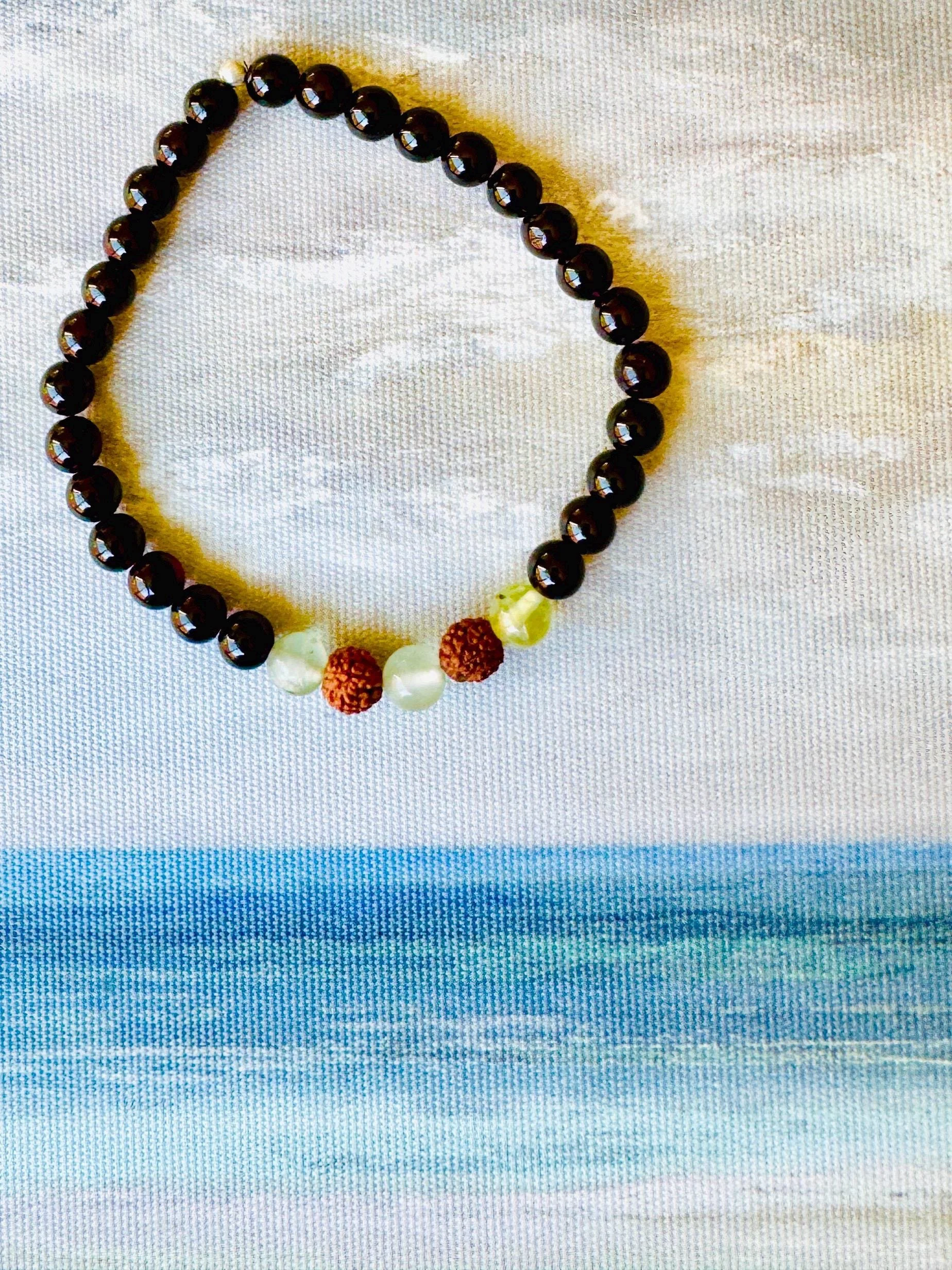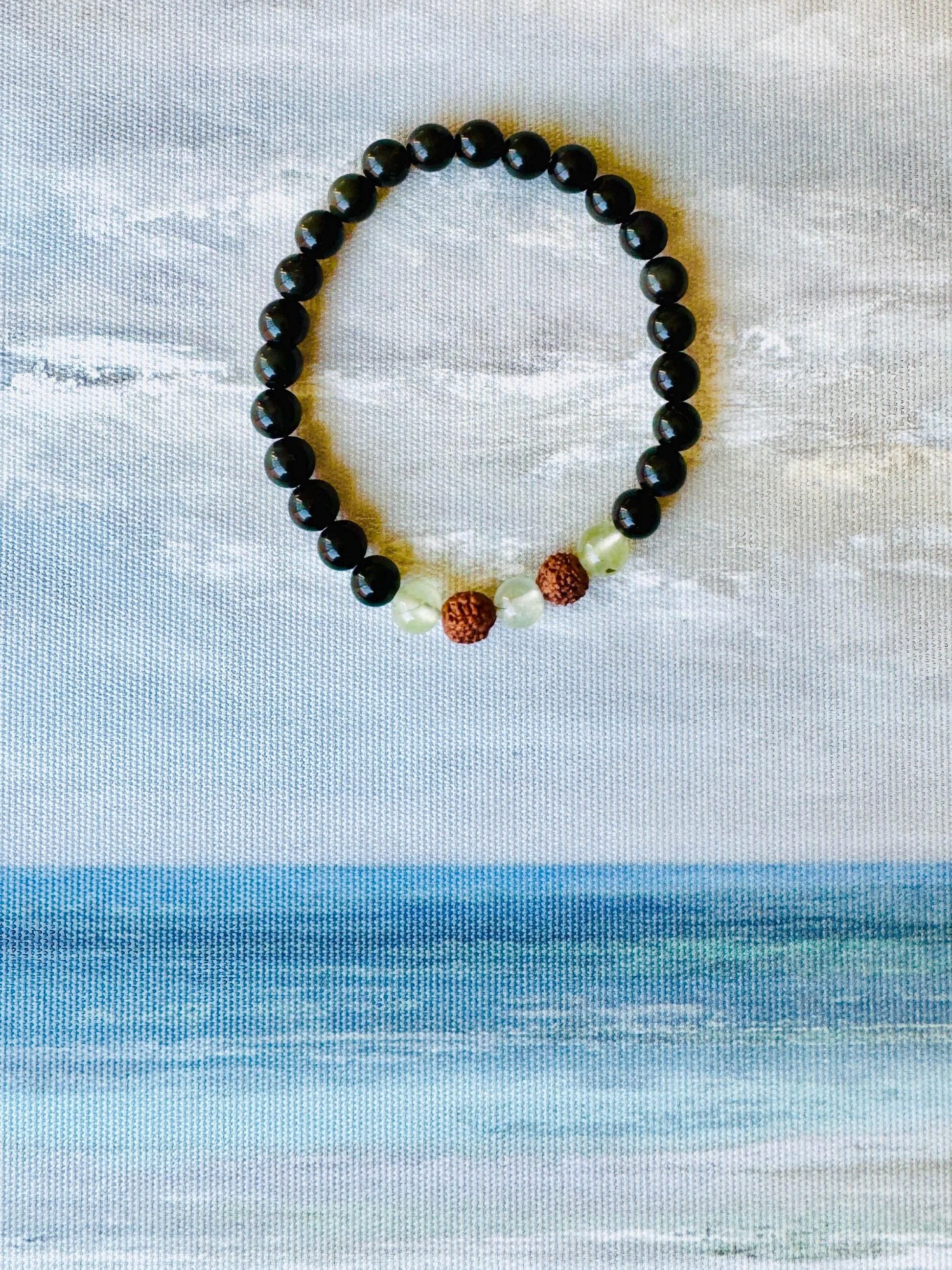 Root + Heart #10 - Obsidian Prehnite Rudraksha Bracelet: Grounding Protection Jewelry