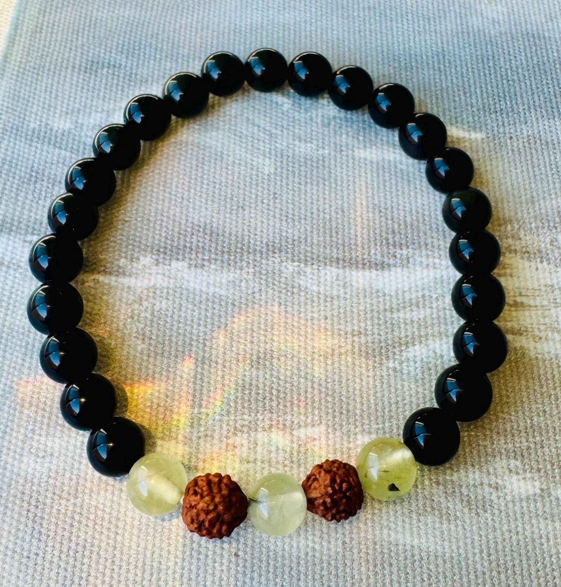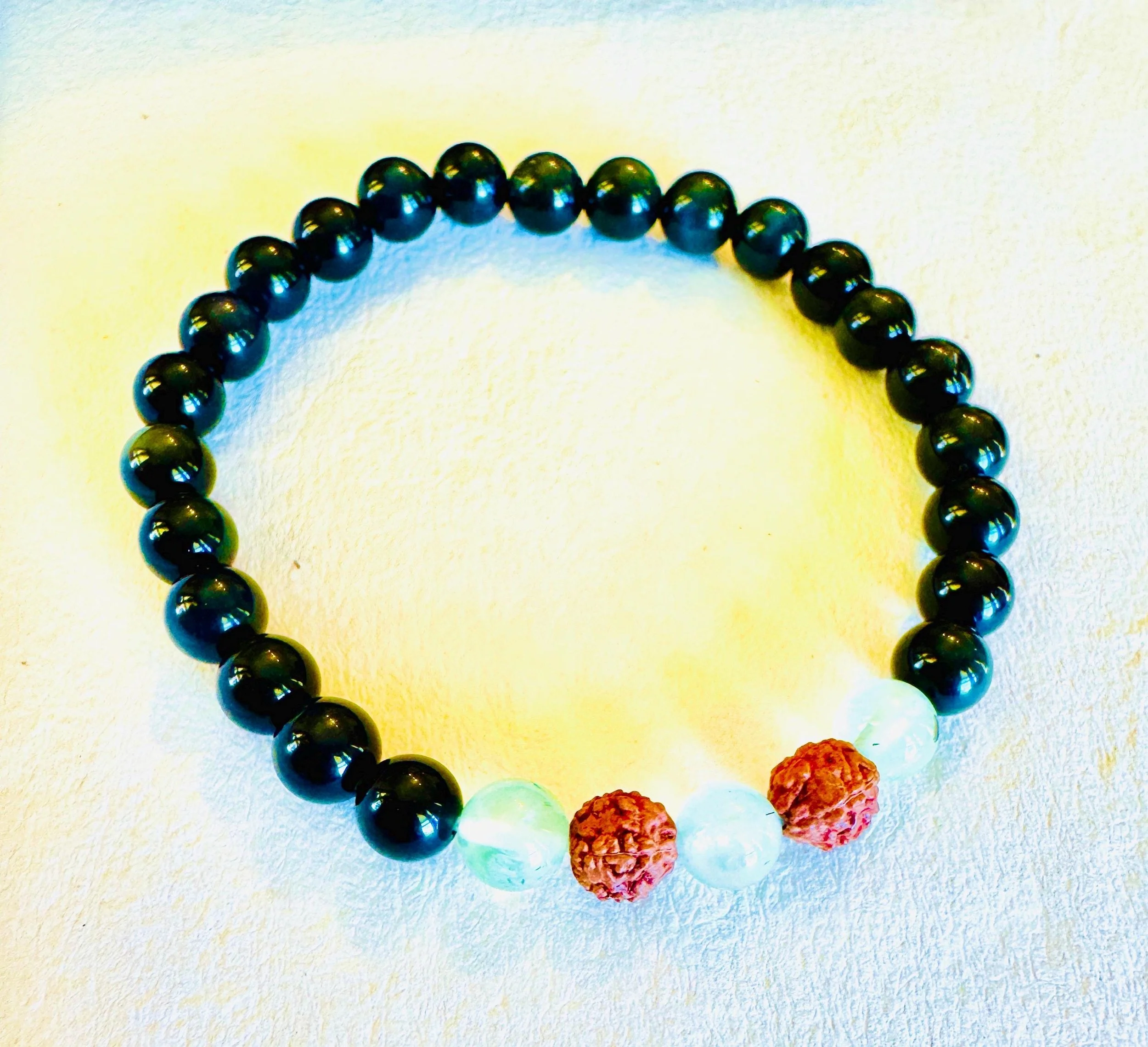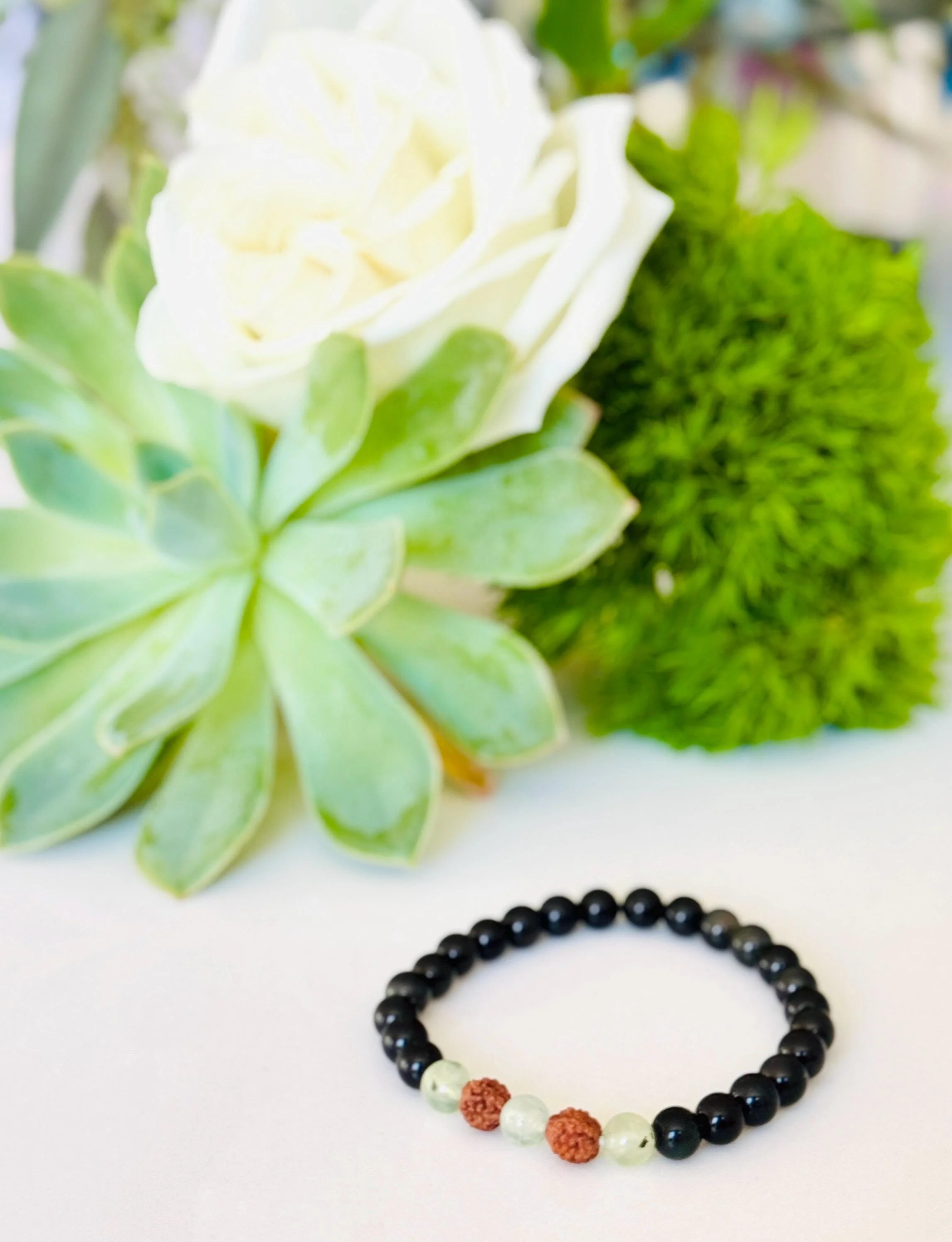 Root + Heart #10 - Obsidian Prehnite Rudraksha Bracelet: Grounding Protection Jewelry