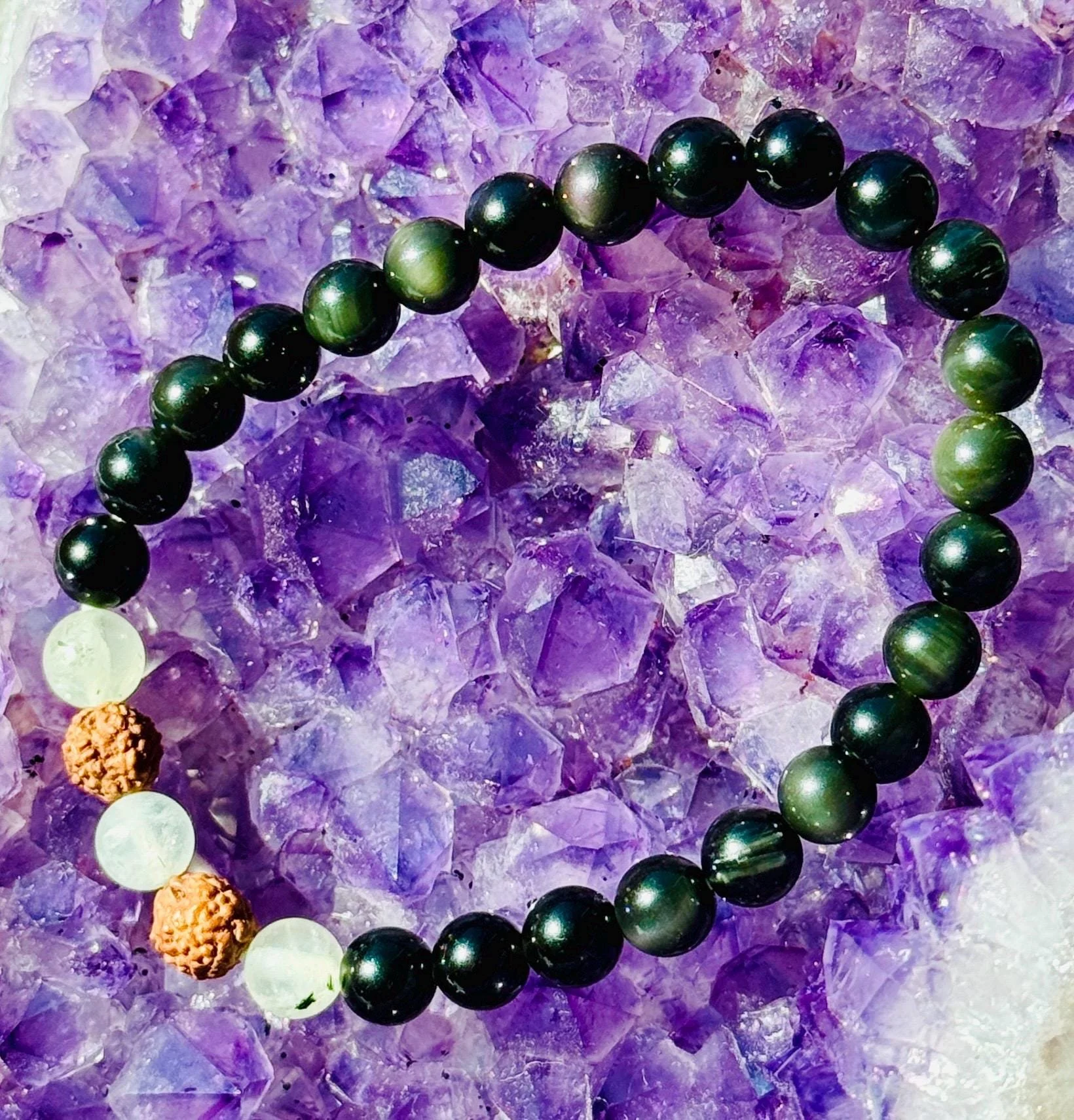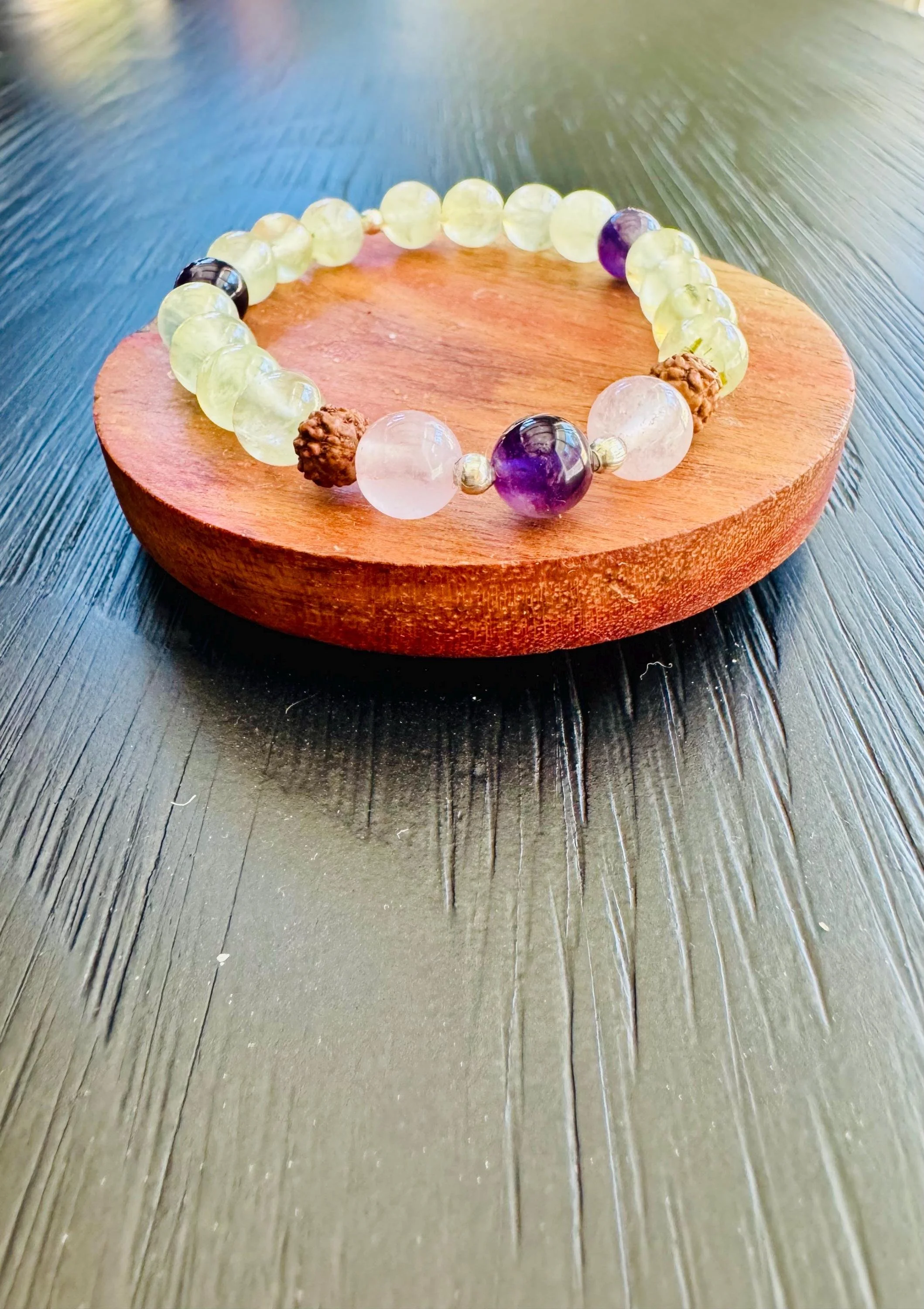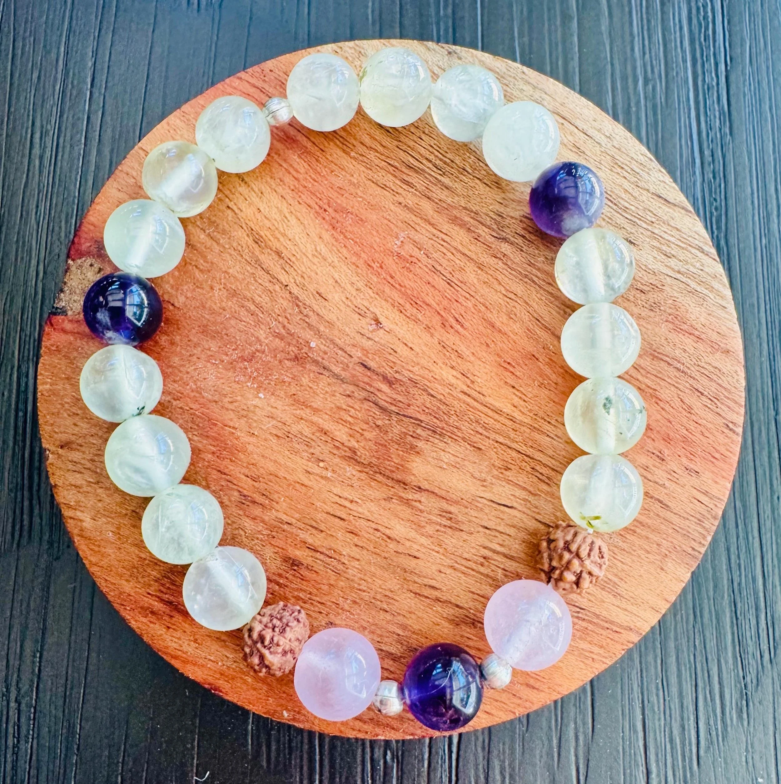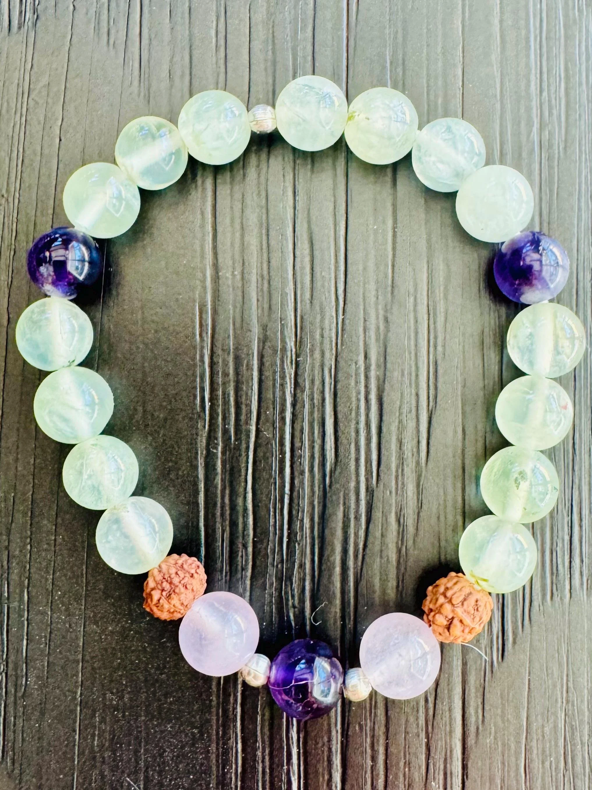 Prehnite, Rudraksha, Amethyst & Rose Quartz Healing Intuition and Love Bracelet