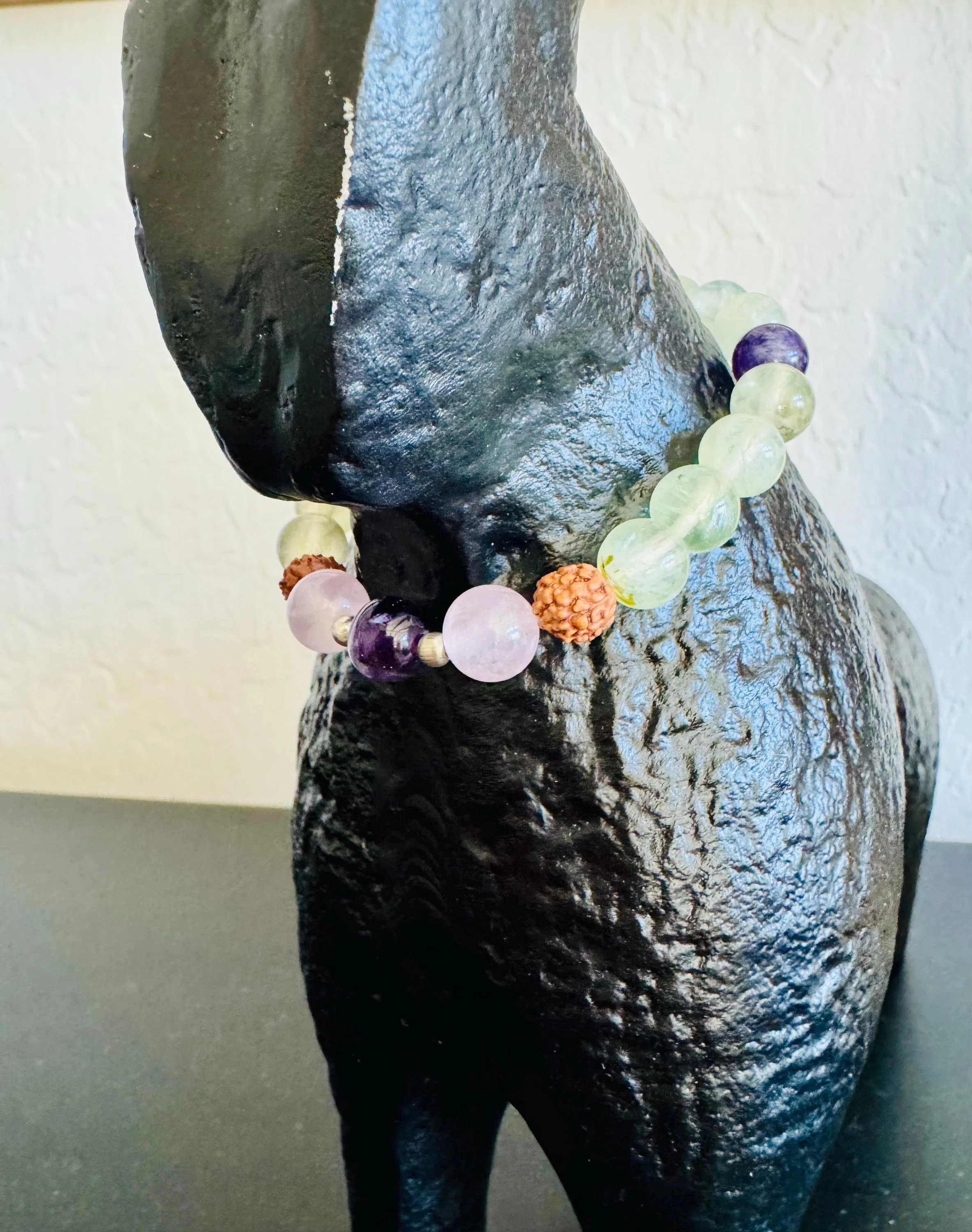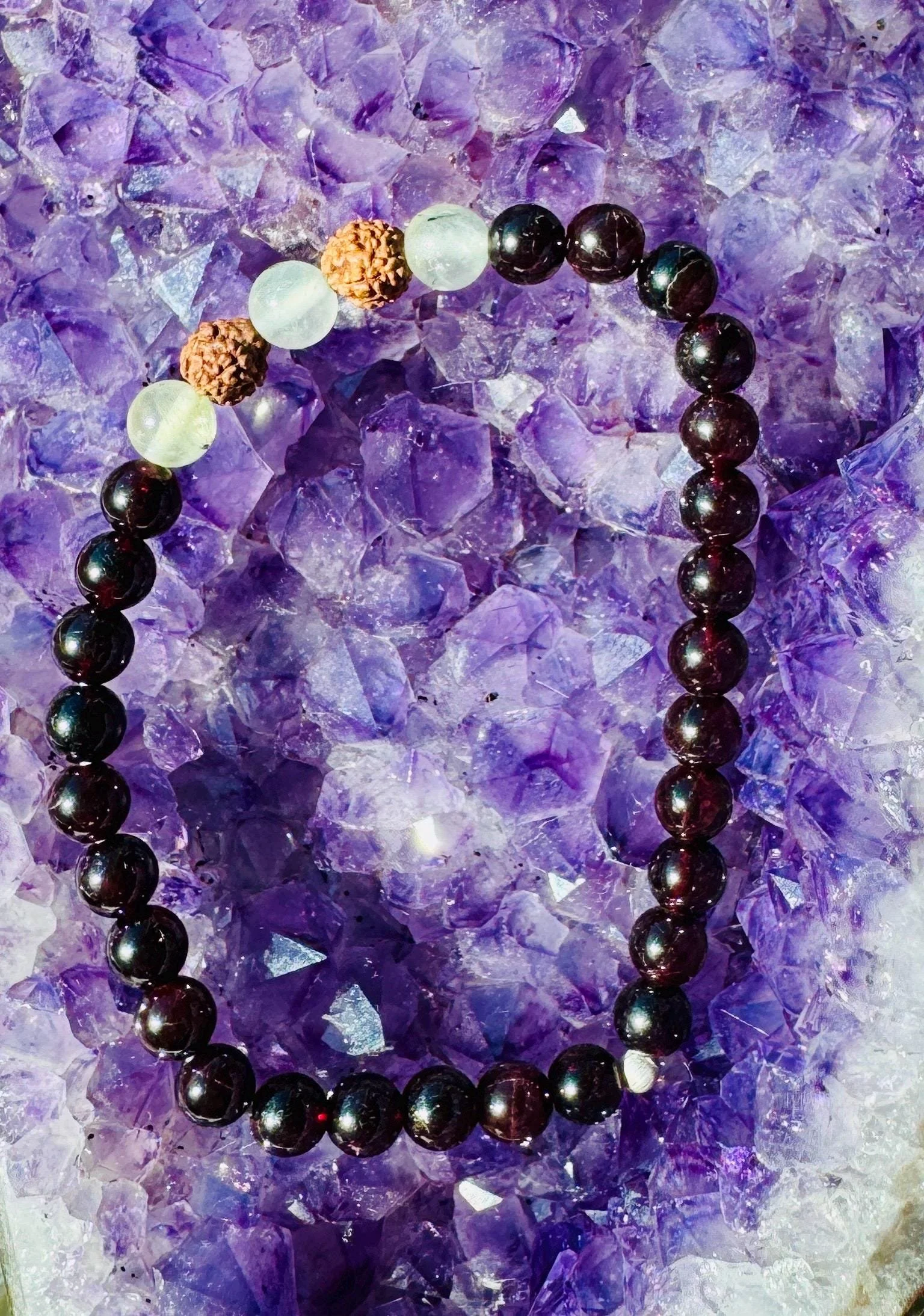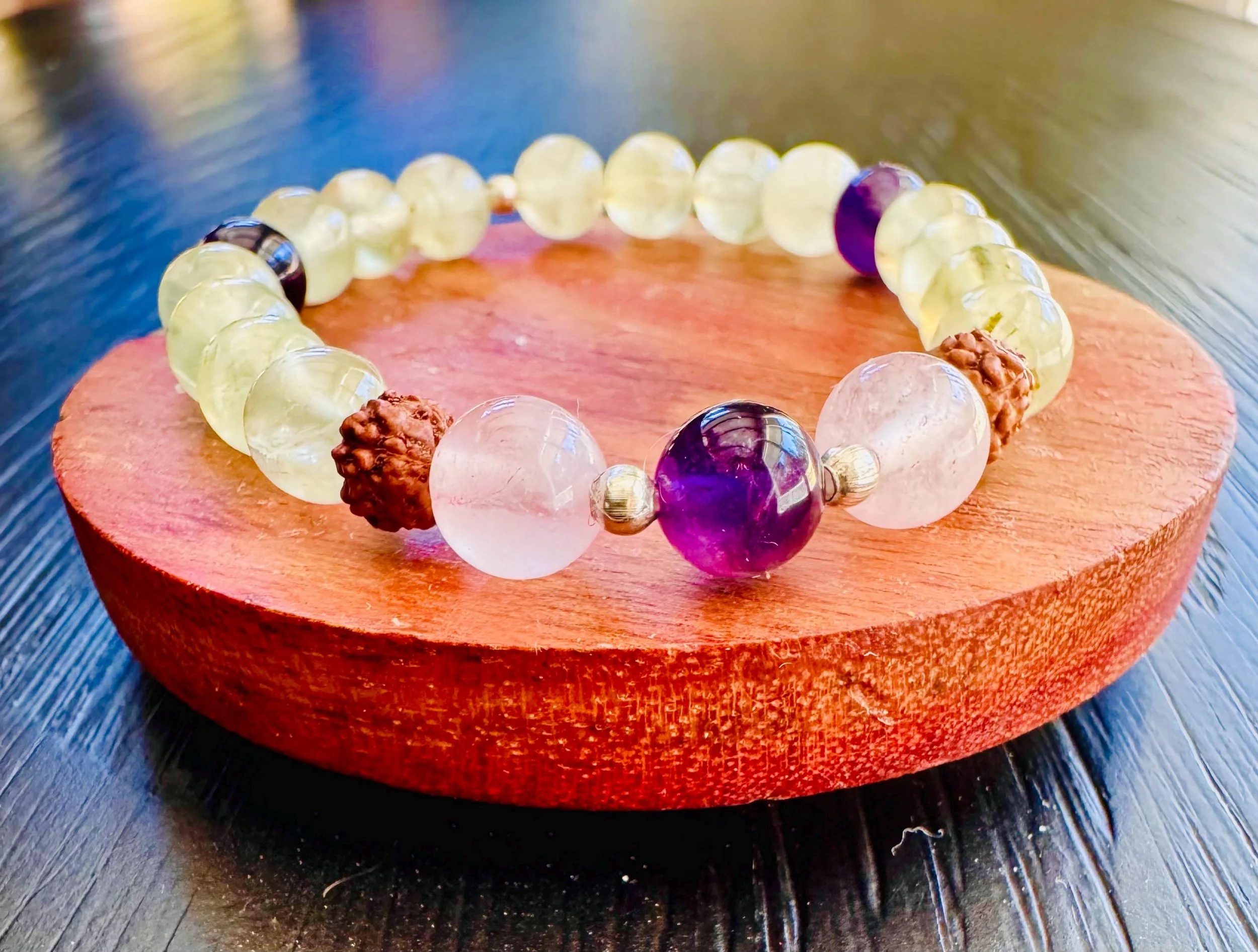 Prehnite, Rudraksha, Amethyst & Rose Quartz Healing Intuition and Love Bracelet